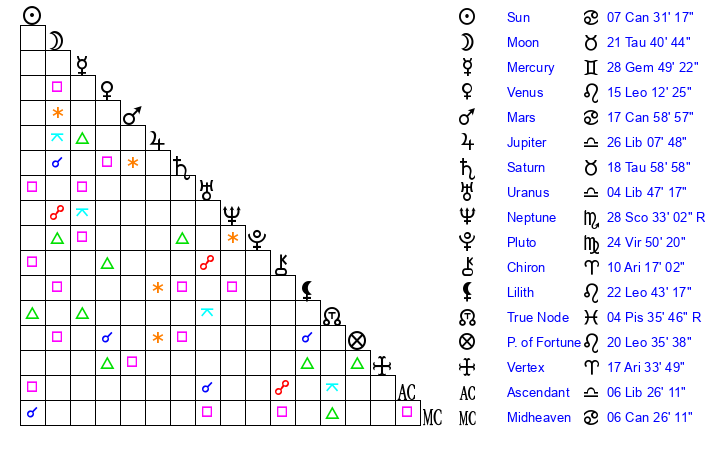 Moon | 21 Taurus 34 | 2 Virgo 54 | 28 Taurus 24 |