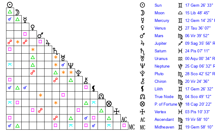 Sun | 17 Gemini 26 | 18 Gemini 9 | 16 Cancer 4 |