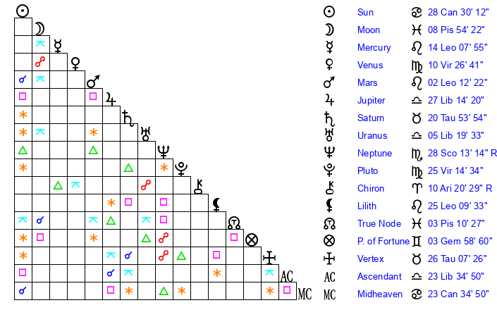 Sun | 28 Cancer 30 | 29 Cancer 11 | 21 Virgo 27 |