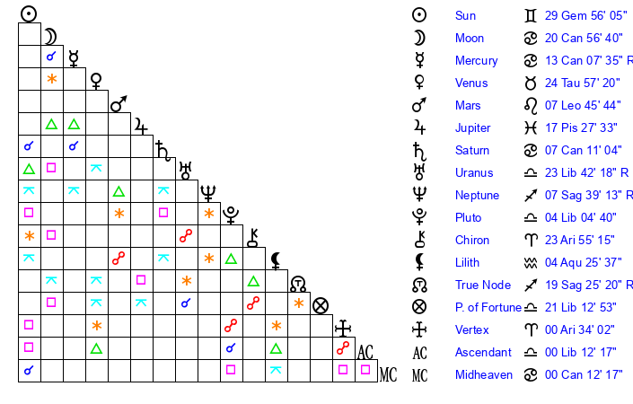 | Moon | 20 Cancer 57 | 9 Taurus 9 | 25 Taurus 48 |