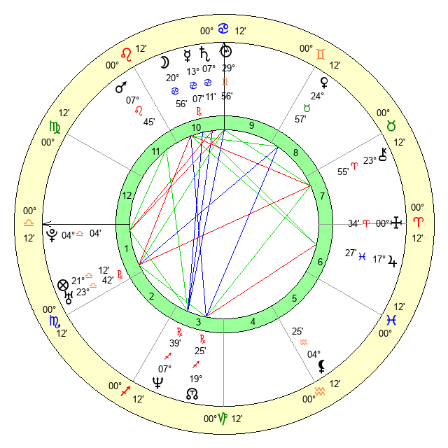| Sun | 29 Gemini 55 | 0 Cancer 34 | 18 Leo 38 |