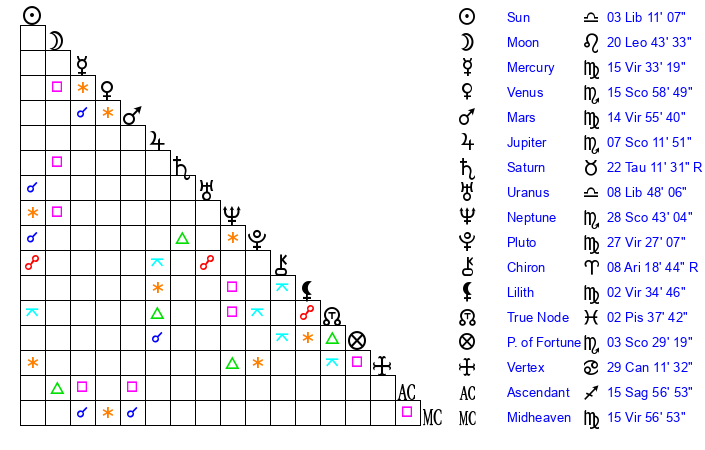 Sun | 3 Libra 11 | 3 Libra 51 | 27 Scorpio 57 |