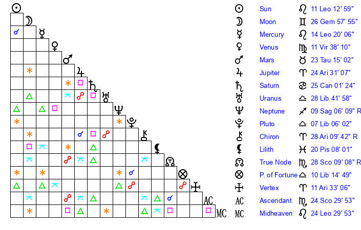| Moon | 26 Gemini 53 | 11 Sagittarius 29 | 29 Aries 12 |