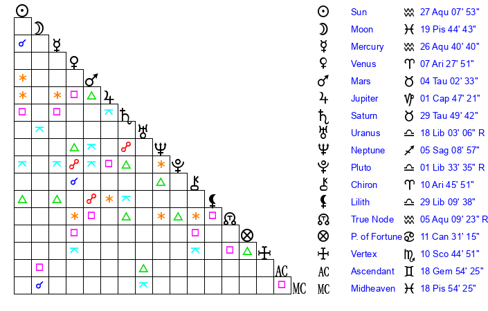 | Sun | 27 Aquarius 7 | 28 Aquarius 16 | 19 Aries 56 |