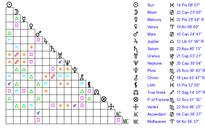 | Mercury | 22 Pisces 29 | 1 Aries 54 | 18 Pisces 10 |