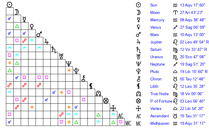 | Moon | 27 Aries 41 | 9 Aries 57 | 20 Sagittarius 17 |