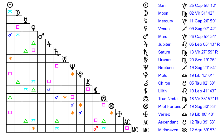 | Mercury | 11 Capricorn 27 | 12 Capricorn 9 | 29 Pisces 44 |