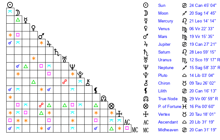 | Moon | 20 Sagittarius 15 | 21 Aries 6 | 10 Virgo 24 |