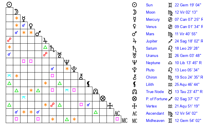 | Sun | 22 Gemini 19 | 22 Gemini 41 | 6 Virgo 0 |