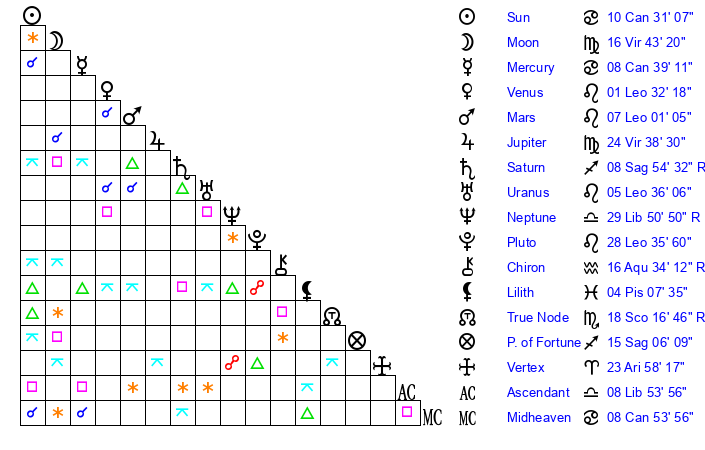 | Moon | 16 Virgo 45 | 9 Libra 59 | 10 Pisces 22 |