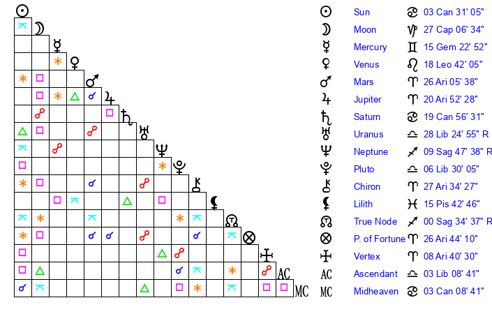| Moon | 27 Capricorn 2 | 8 Cancer 1 | 28 Scorpio 55 |