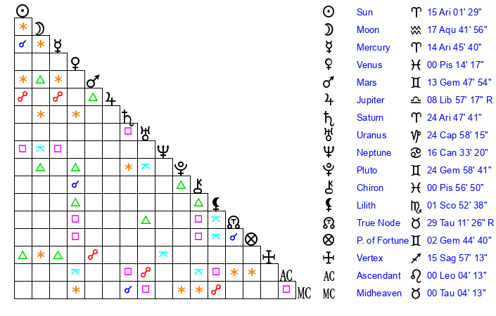 | Sun | 15 Aries 2 | 16 Aries 9 | 5 Leo 40 |
