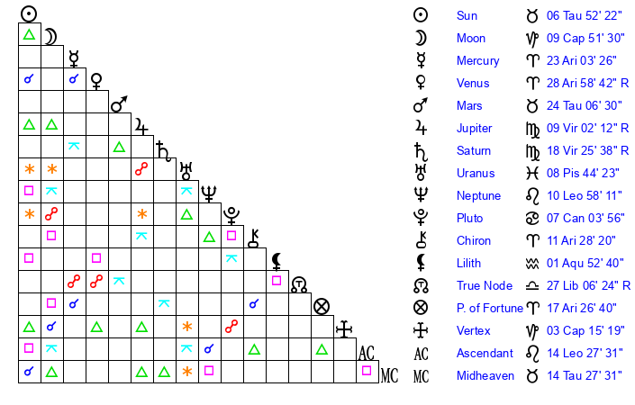 Moon | 9 Capricorn 47 | 6 Taurus 15 | 5 Scorpio 55 |