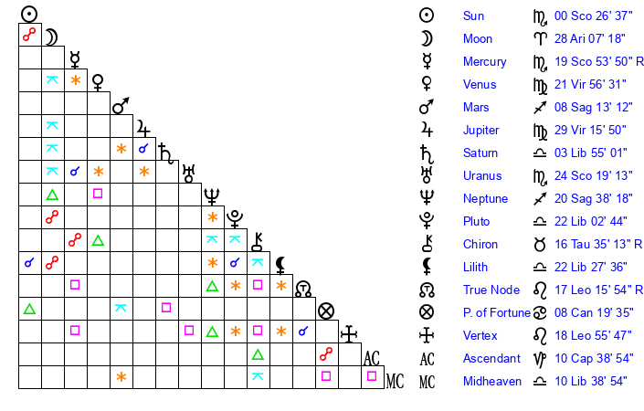 | Moon | 28 Aries 6 | 24 Scorpio 27 | 16 Sagittarius 58 |