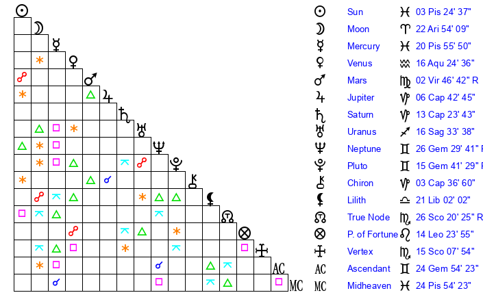 | Sun | 3 Pisces 24 | 4 Pisces 19 | 4 Cancer 21 |