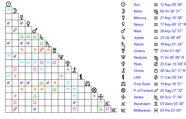 | Saturn | 18 Aquarius 11 | 17 Pisces 26 | 27 Aquarius 17 |