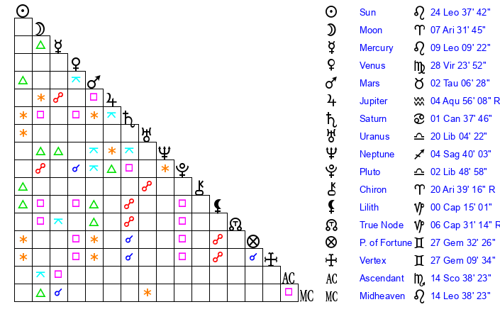 | Sun | 24 Leo 37 | 25 Leo 2 | 15 Libra 16 |