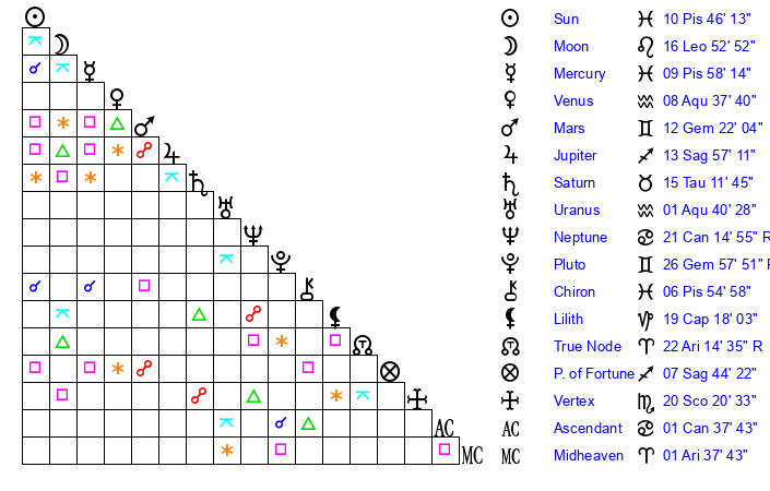 | Sun | 10 Pisces 46 | 11 Pisces 22 | 0 Cancer 52 |