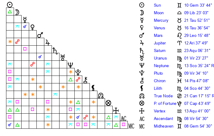 Pluto | 9 Virgo 34 | 3 Aquarius 38 | 10 Virgo 47 |