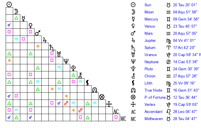 | Sun | 20 Taurus 20 | 21 Taurus 15 | 11 Virgo 30 |