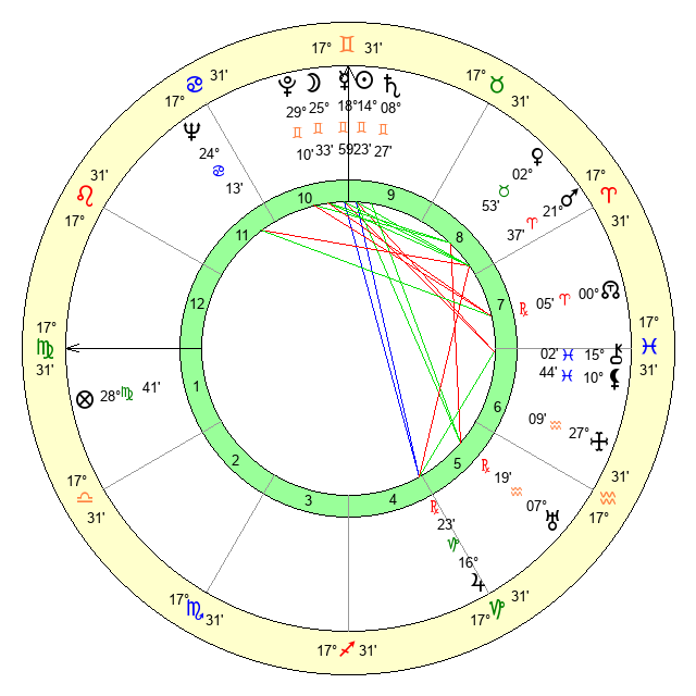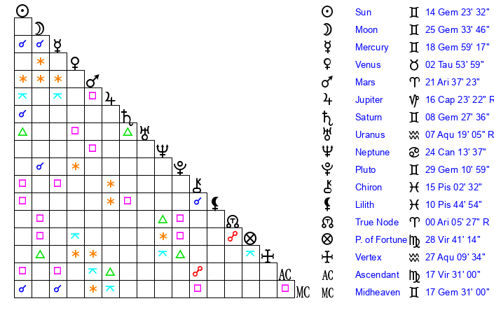 | Sun | 14 Gemini 23 | 15 Gemini 17 | 2 Libra 0 |