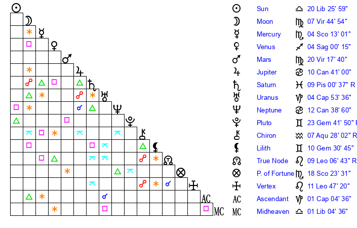 | Sun | 20 Libra 26 | 21 Libra 36 | 20 Aquarius 50 |