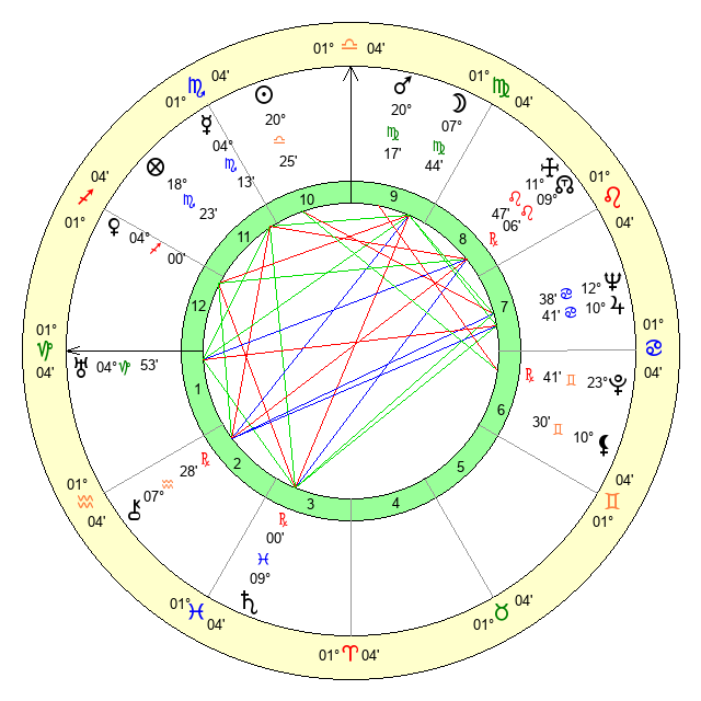 | Moon | 7 Virgo 44 | 3 Leo 23 | 23 Capricorn 33 |