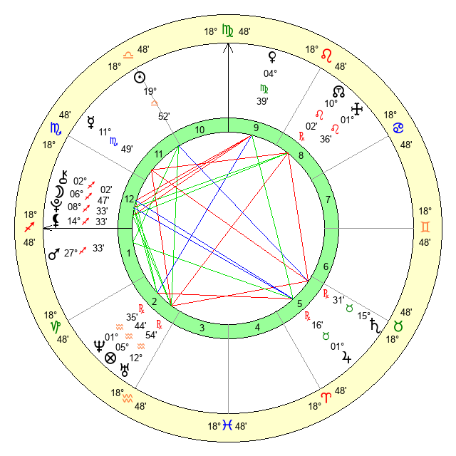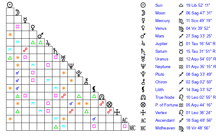 | Moon | 6 Sagittarius 54 | 19 Cancer 18 | 21 Scorpio 21 |