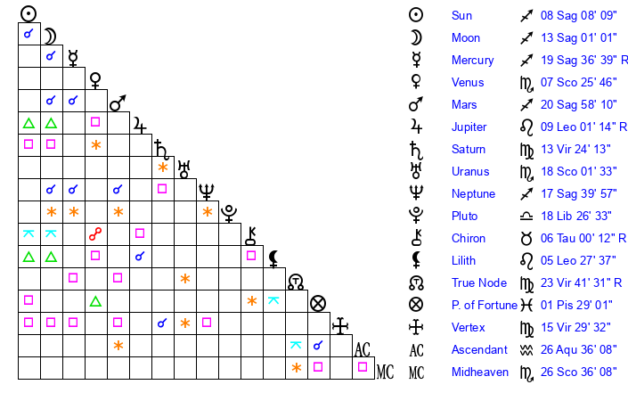 | Neptune | 17 Sagittarius 40 | 27 Pisces 8 | 19 Sagittarius 20 |