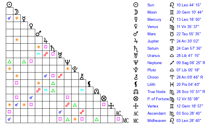 | Moon | 20 Gemini 5 | 5 Sagittarius 27 | 23 Aries 15 |