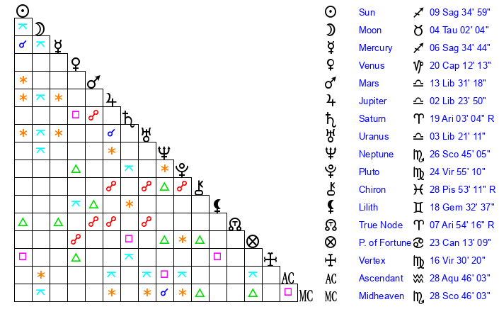 Moon | 3 Taurus 59 | 15 Sagittarius 10 | 21 Taurus 35 |