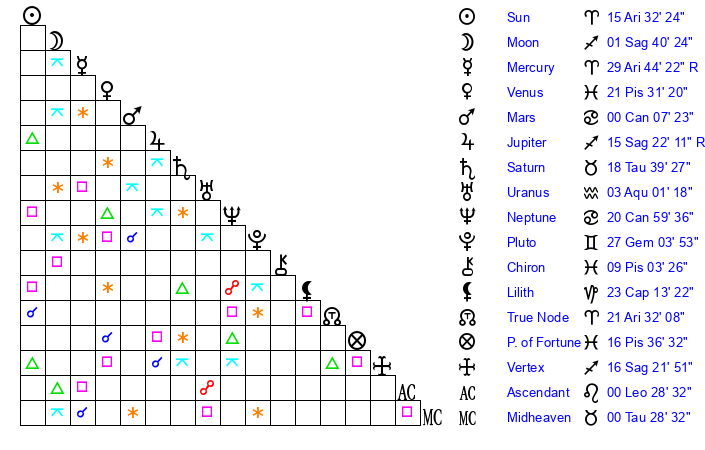 | Sun | 15 Aries 32 | 16 Aries 9 | 4 Leo 15 |