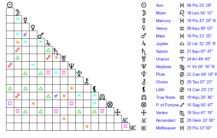 | Mercury | 19 Pisces 47 | 24 Pisces 8 | 25 Gemini 31 |
