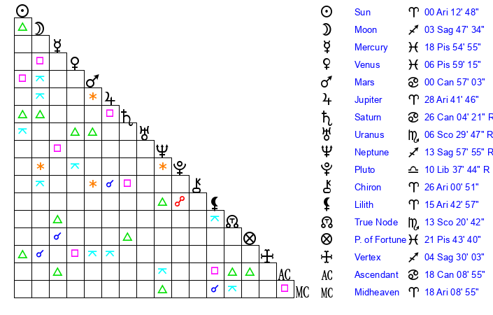 | Neptune | 13 Sagittarius 57 | 29 Pisces 37 | 13 Sagittarius 14 |