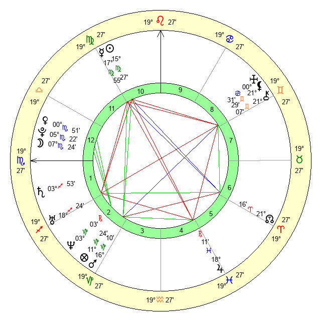 | Mercury | 17 Virgo 56 | 11 Virgo 19 | 17 Scorpio 39 |