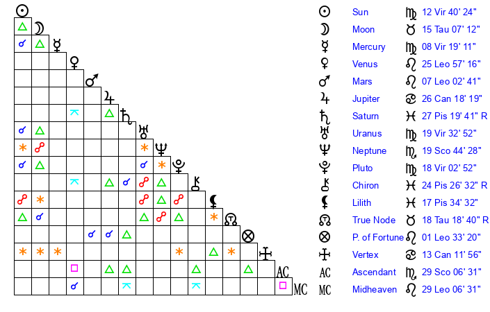 | Moon | 15 Taurus 4 | 16 Aquarius 53 | 12 Cancer 42 |