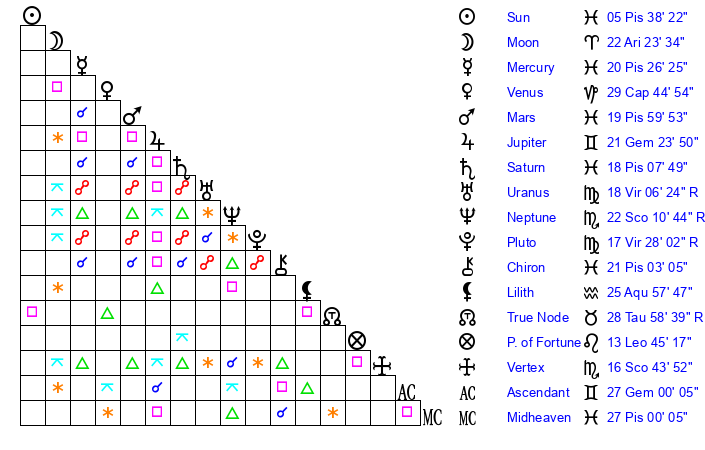 Moon | 22 Aries 26 | 22 Capricorn 44 | 20 Gemini 9 |