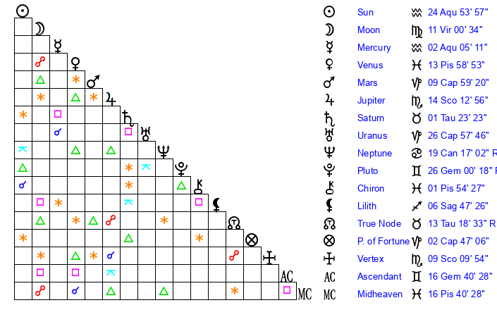 | Sun | 24 Aquarius 54 | 26 Aquarius 15 | 16 Gemini 46 |