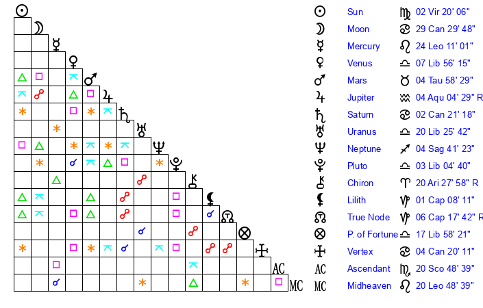 Mercury | 24 Leo 11 | 16 Leo 6 | 17 Scorpio 35 |