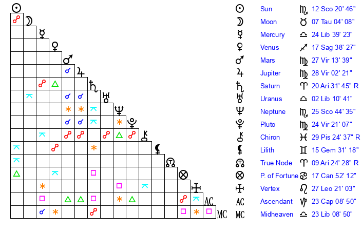 Moon | 6 Taurus 59 | 18 Sagittarius 24 | 24 Taurus 55 |