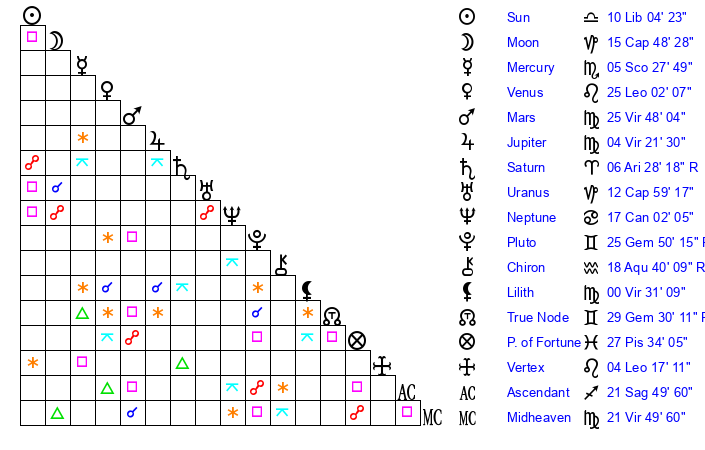 | Sun | 10 Libra 4 | 10 Libra 44 | 8 Aquarius 10 |