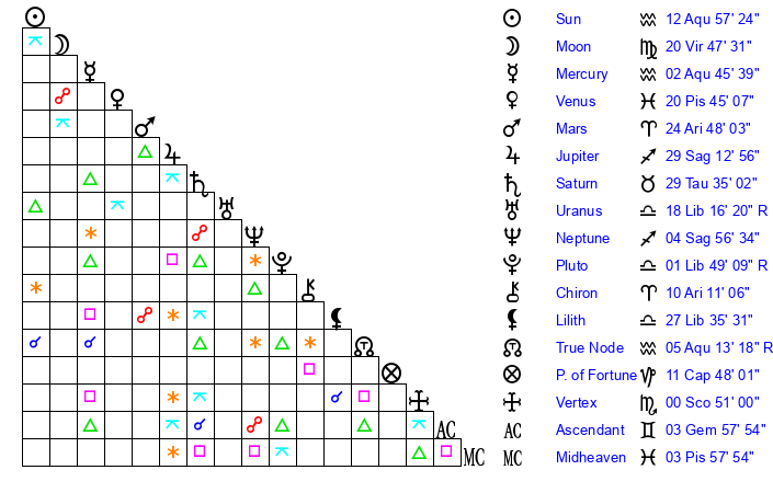 | Sun | 12 Aquarius 57 | 14 Aquarius 6 | 6 Aries 8 |