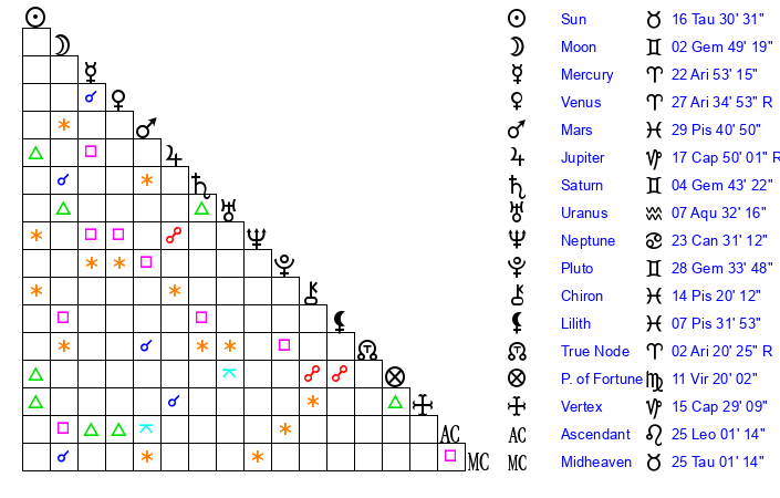 | Sun | 16 Taurus 30 | 17 Taurus 23 | 3 Virgo 47 |