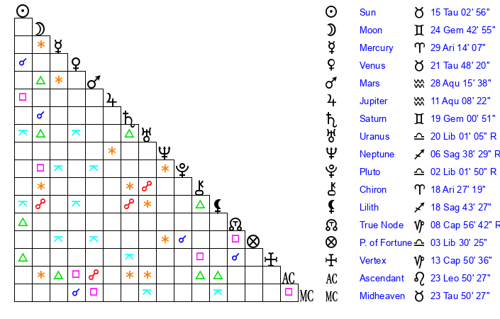 Moon | 24 Gemini 40 | 28 Leo 42 | 12 Taurus 1 |