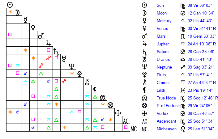 | Venus | 0 Virgo 31 | 8 Leo 24 | 12 Virgo 14 |
