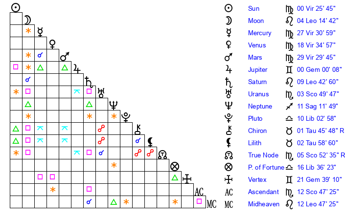 | Moon | 4 Leo 11 | 2 Virgo 52 | 23 Taurus 29 |
