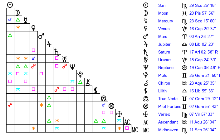 | Sun | 16 Scorpio 20 | 17 Scorpio 27 | 12 Pisces 55 |