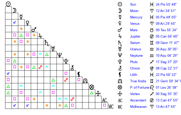 Sun | 24 Pisces 56 | 25 Pisces 22 | 17 Aries 42 |