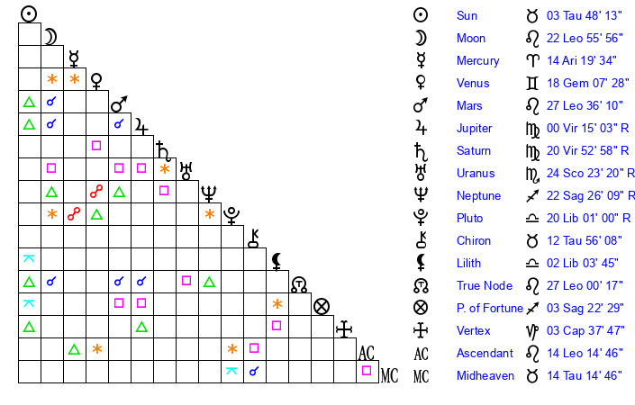 Sun | 3 Taurus 48 | 3 Taurus 55 | 17 Gemini 12 |