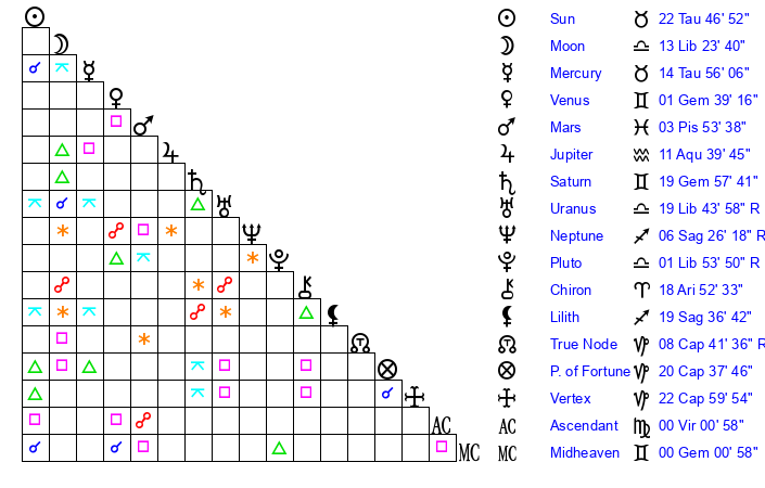 Moon | 13 Libra 19 | 4 Sagittarius 13 | 10 Virgo 16 |